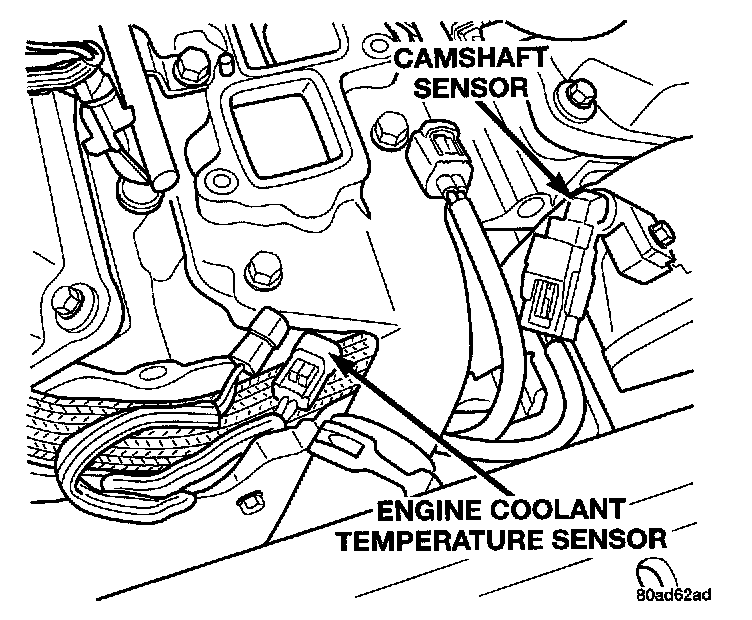 The engine coolant temperature sensor threads into the water jacket next to thermostat housing. The sensor provides an input to the Powertrain Control Module (PCM). As coolant temperature varies, the sensor resistance changes, resulting in a different input voltage to the PCM.