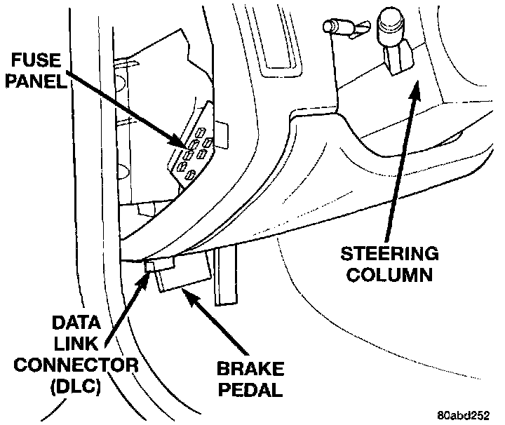 The data link connector (diagnostic connector) links the DRB scan tool with the Powertrain Control Module (PCM). The data link connector is located inside the vehicle, below instrument panel next to the center column.