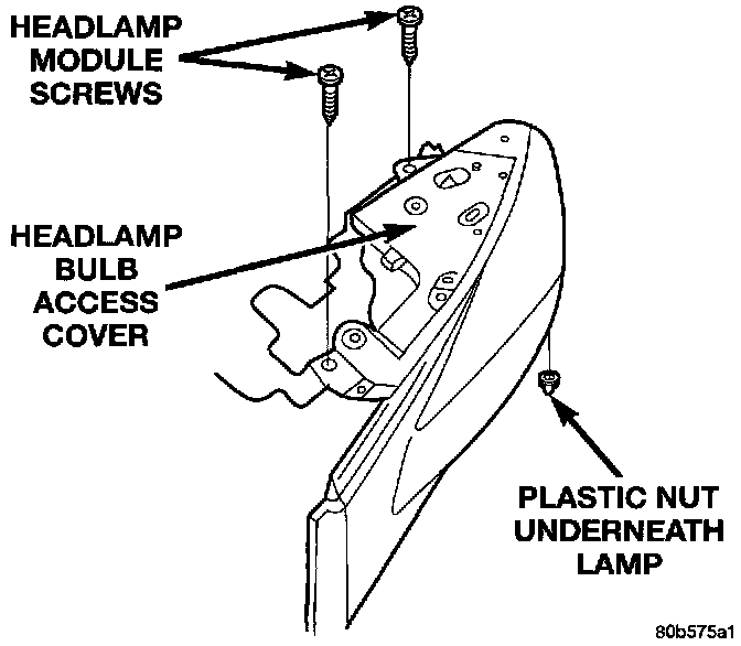4. Remove plastic nut attaching front of headlamp to mounting bracket from underside of headlamp module.