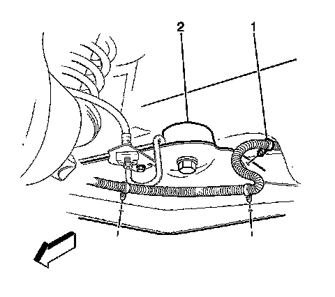 8. Remove the brake pipe clip bolt (2) from the passenger side of the crossmember (1).