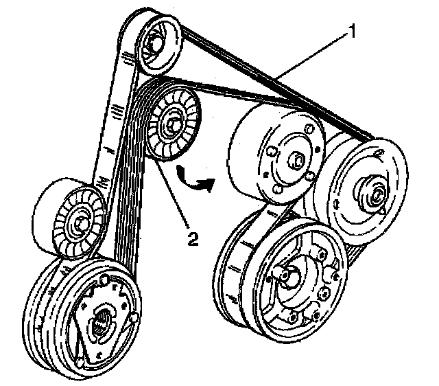 2. Rotate the drive belt tensioner (2) clockwise to relieve the tension on the drive belt (1).