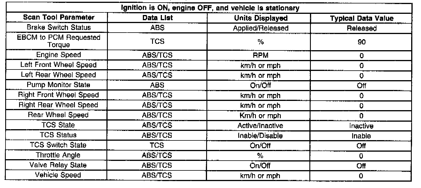 Use the EBCM Scan Tool Data Lists as directed by a diagnostic table or in order to supplement the diagnostic procedures. Begin all the diagnostic procedures with the ABS Diagnostic Starting Point. Use the EBCM Scan Tool Data Lists only after the following is determined:
