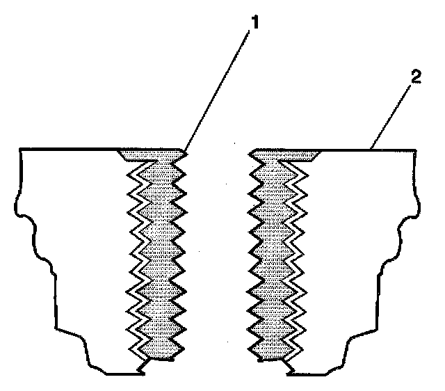 A properly installed insert (1) will be either flush or slightly below flush with the surface of the base material (2).