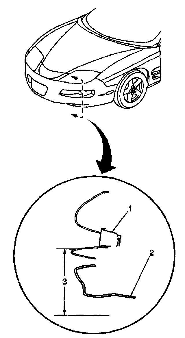 1. Calculate the trim heights (3) as measured from the ground to the bottom of the park/turn signal lamp (1) after each jounce/rebound cycle. Record your measurement.
