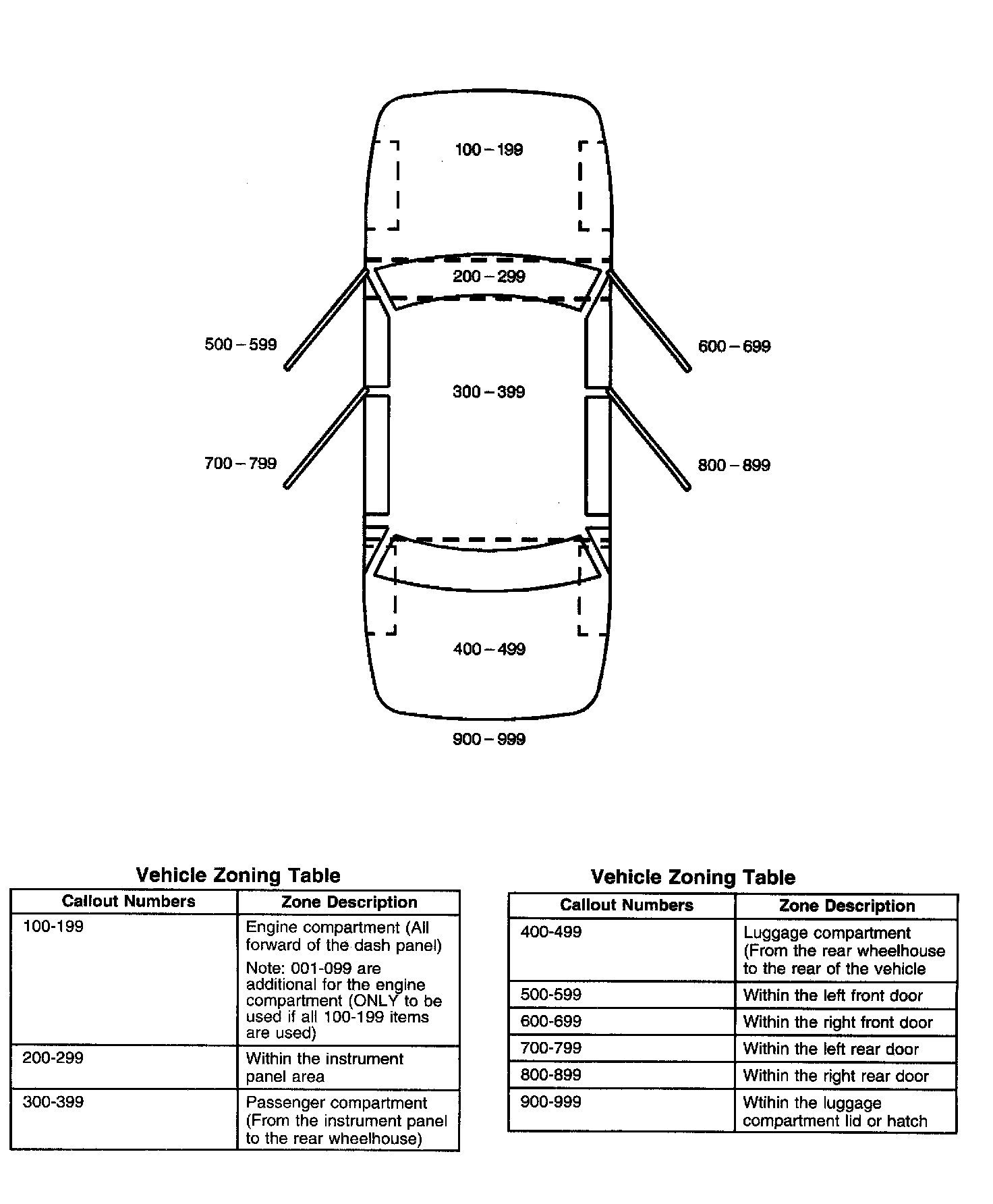 All grounds, in-line connectors, pass-through grommets, and splices have identifying numbers that correspond to where they are located in the vehicle. The following table explains the numbering system.