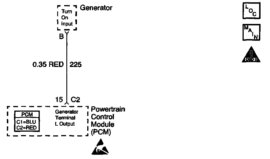 The L-terminal circuit from the generator is a discrete circuit (a discrete circuit has no splices and only one source and one destination) into the PCM. The. PCM applies ignition voltage to the generator L terminal circuit. A small amount of current flows from this circuit through the generator windings to create a magnetic field which starts the generator process. When the generator is at operating speed and producing voltage, a solid state switch for the L terminal circuit in the generator opens and the PCM detects that the initial startup current flow has stopped.