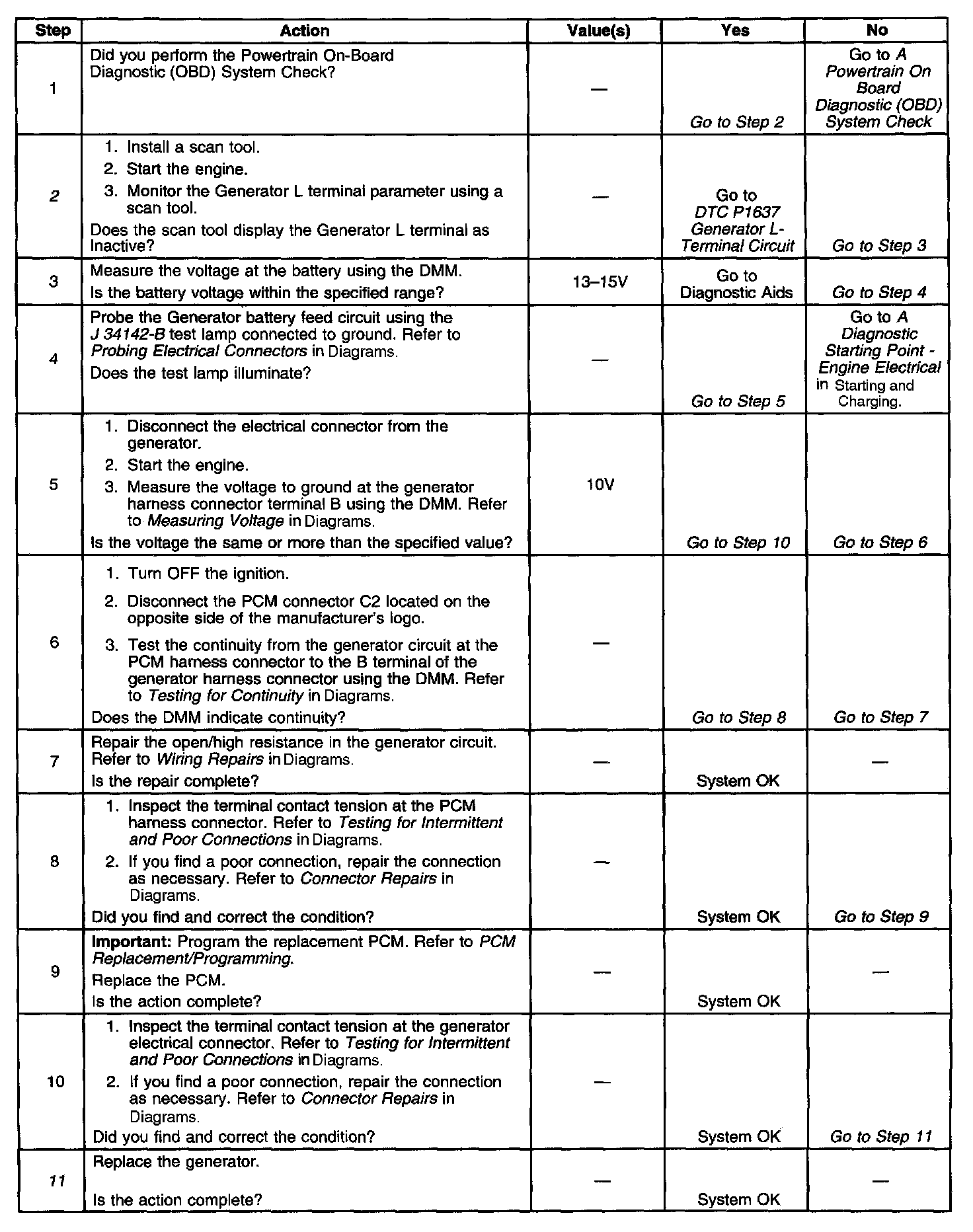 The PCM expects to detect low voltage on the L terminal circuit prior to the generator rotating at operating speed and conversely expects the circuit to be at ignition voltage potential when the generator is operational. When the PCM detects a fault (circuit shorted to ground, or circuit shorted to a voltage), the battery lamp will illuminate.