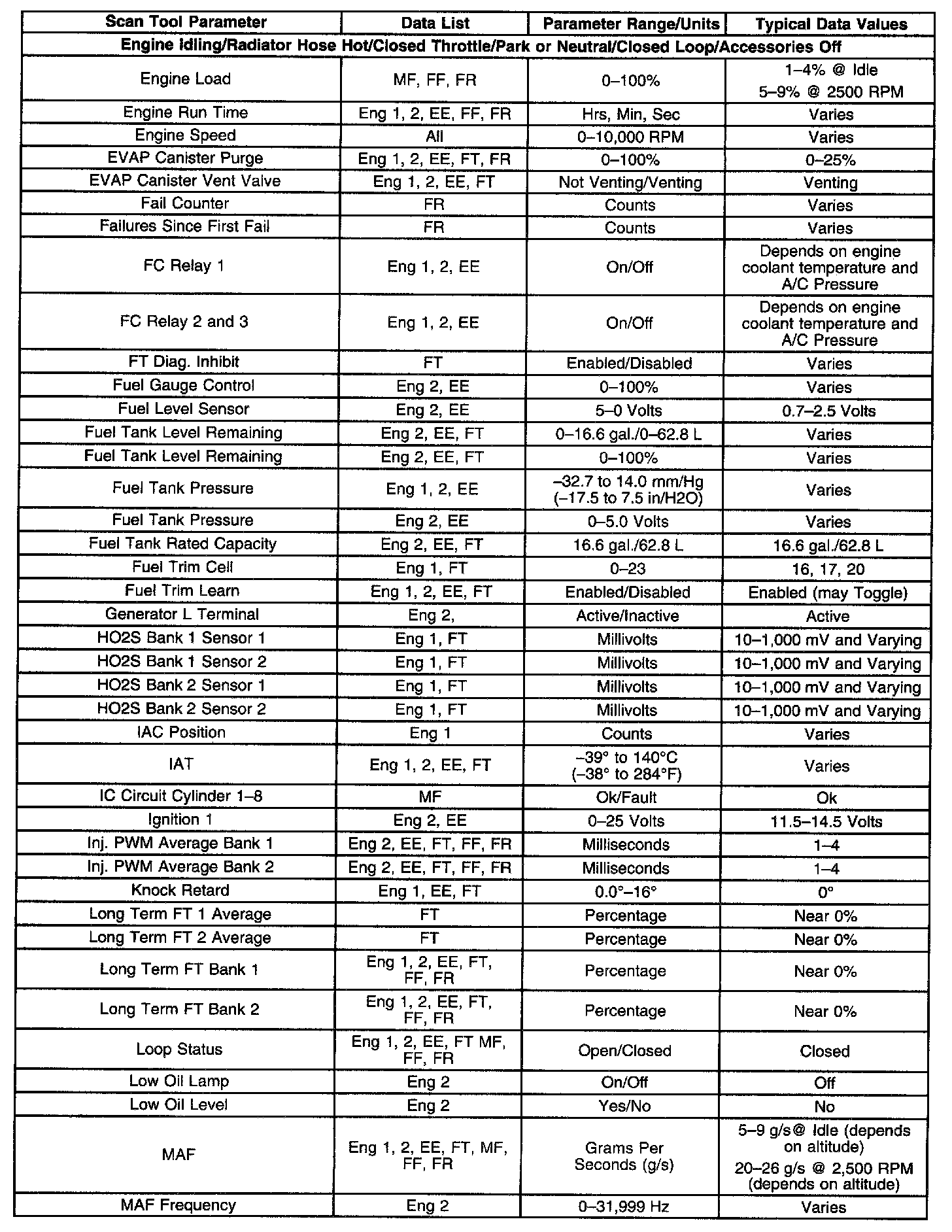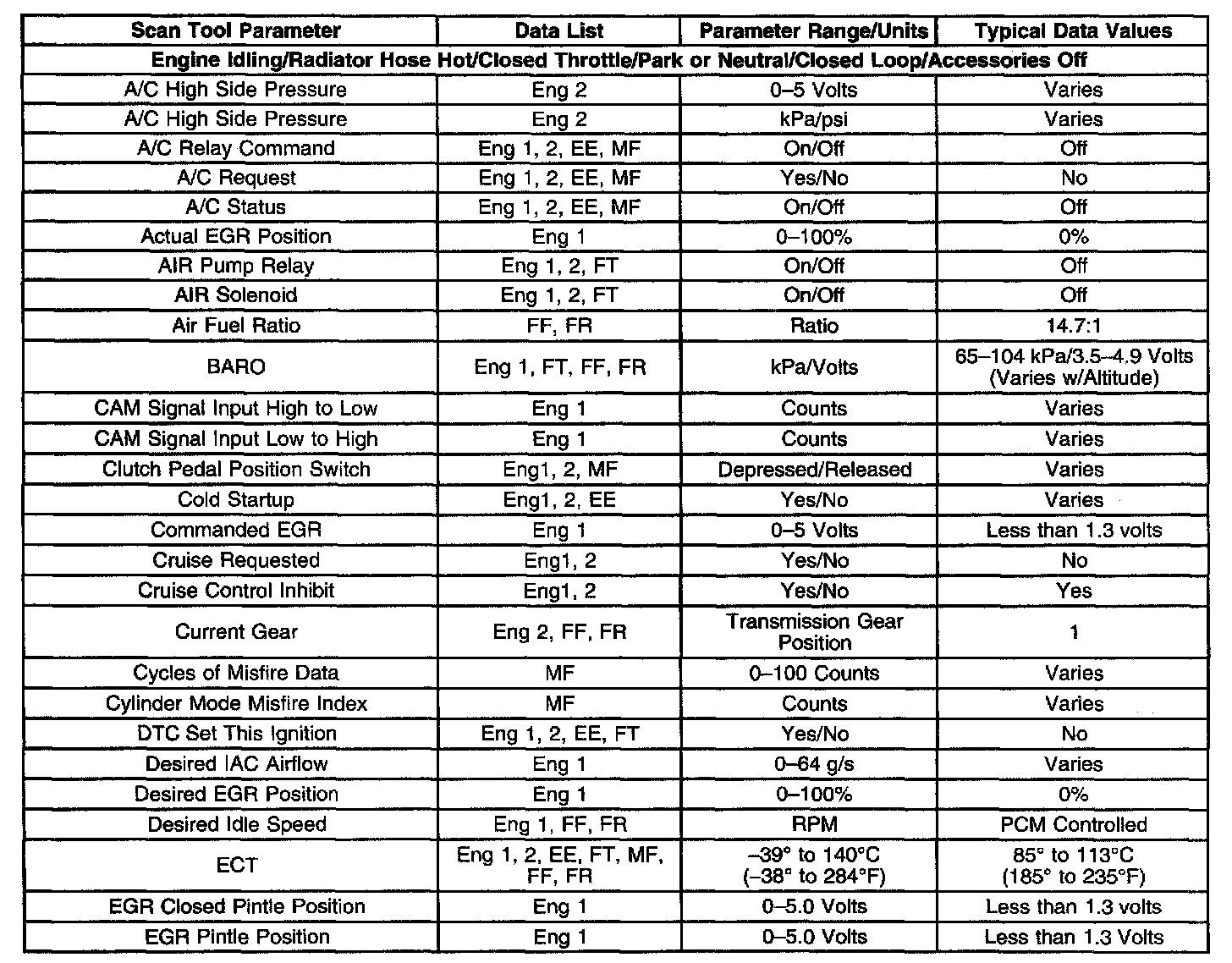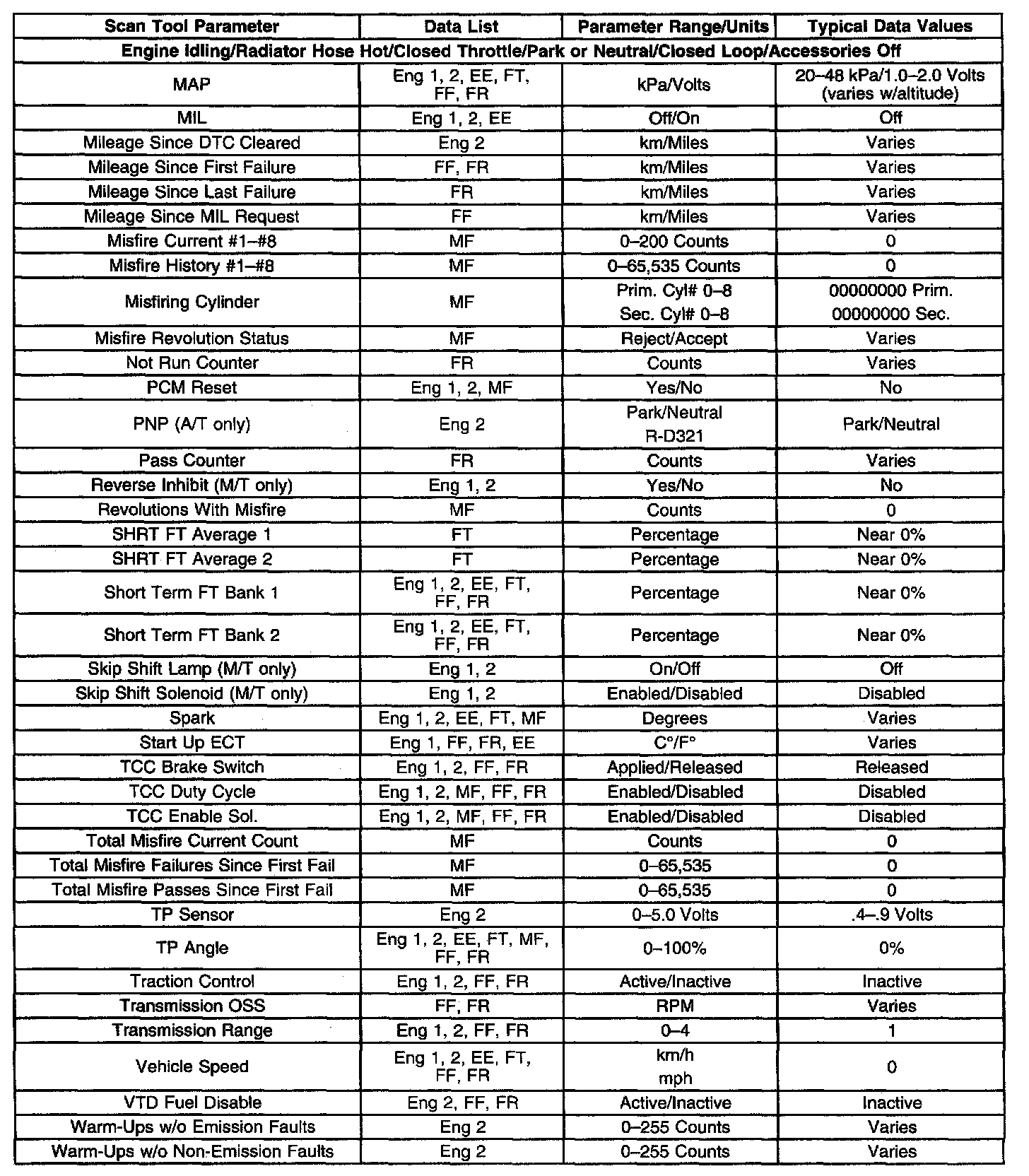 The column labeled Data List indicates where a parameter can be located on the scan tool. Refer to the scan tool operating manual for the exact locations of the data lists. The following is a description of each term listed: