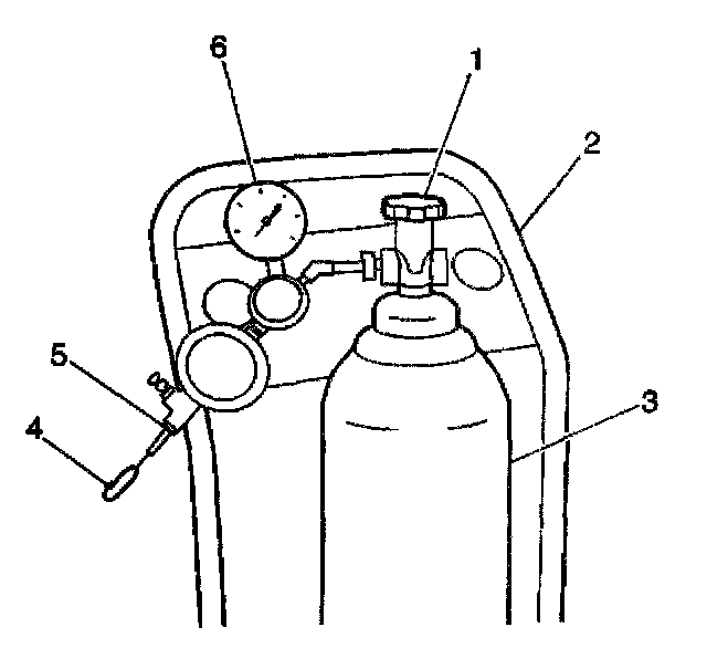 6. Disconnect the black hose (4) that connects the nitrogen cylinder to the J 41413 cart at the pressure regulator (5) by unscrewing the knurled nut on the regulator.