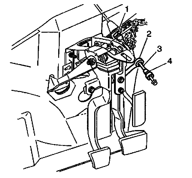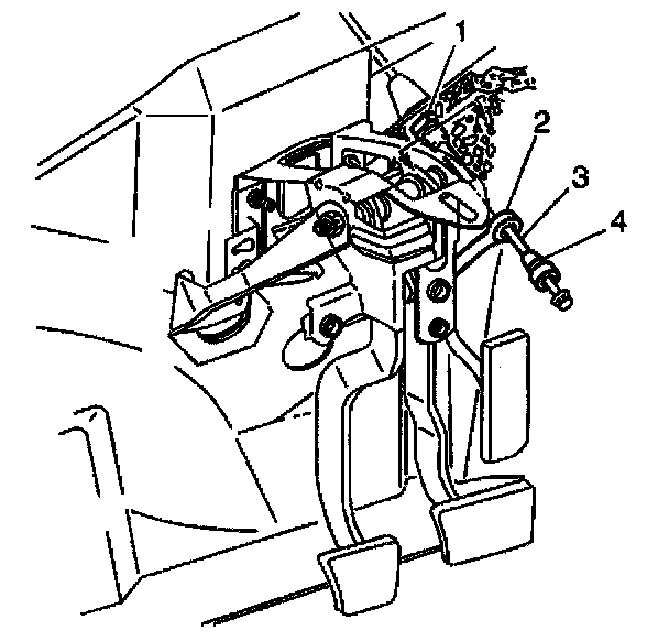 2. Install the accelerator cable (3) through the slot in the accelerator pedal lever (2). Seat the retainer (4) in the accelerator pedal lever (2).