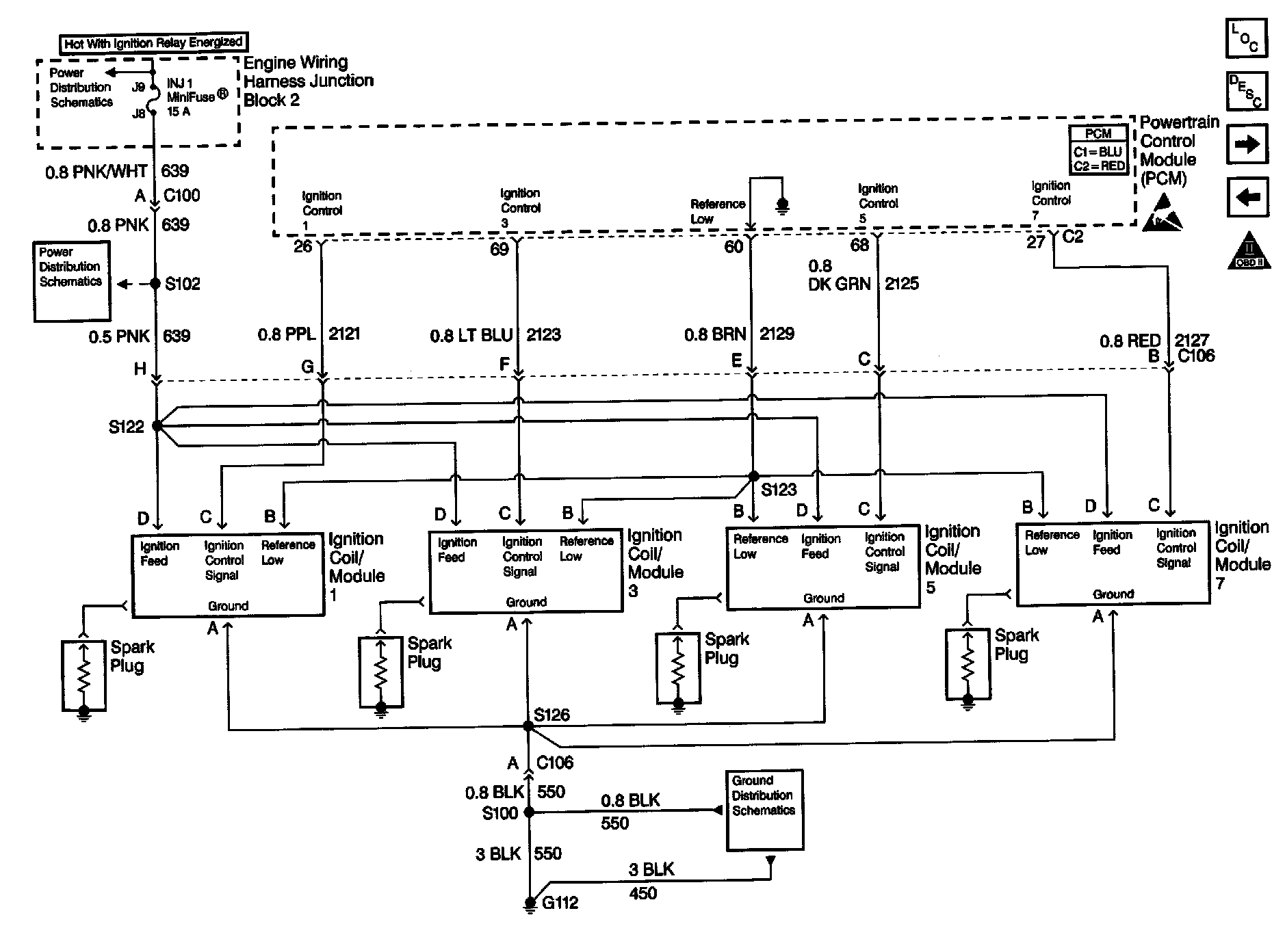 The ignition system on this engine uses an individual ignition coil/module for each cylinder. The PCM controls the ignition system operation. There are eight Ignition Control (IC) circuits, one per cylinder, that connect the PCM and the ignition coil/modules. Each ignition coil/module has a power feed, a chassis ground circuit, and a reference low circuit. The PCM causes a spark to occur by grounding the IC circuit, which signals the ignition module to trigger the ignition coil and fire the spark plug. The PCM controls the sequencing and timing.