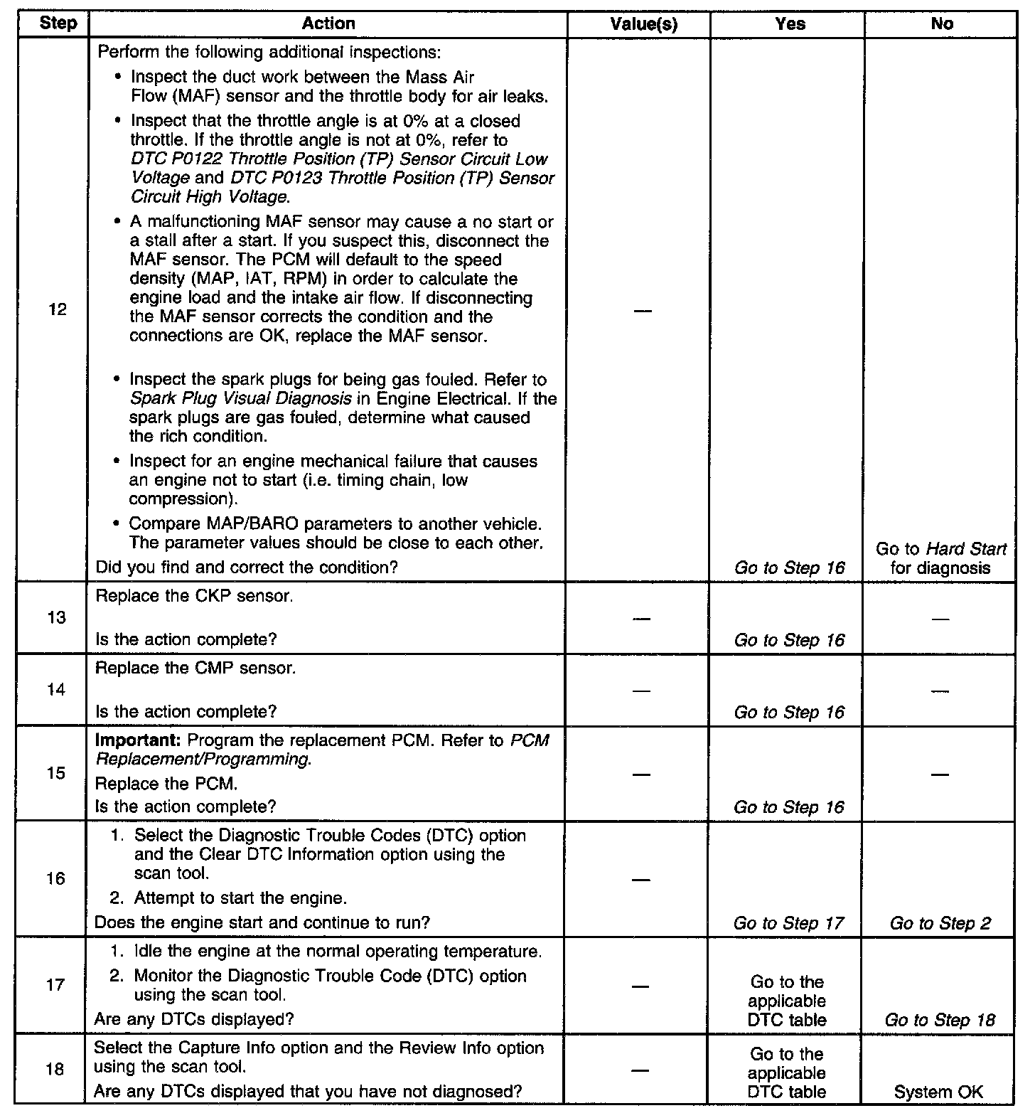 ^ A malfunctioning MAF sensor may cause a no start or a stall after start. If you suspect this, disconnect the MAF sensor. The PCM will default to the speed density (MAP, IAT, RPM) in order to calculate the load and the air flow. If this corrects the condition and the connections are OK, replace the MAF sensor. Refer to MAF Sensor Replacement for procedures.