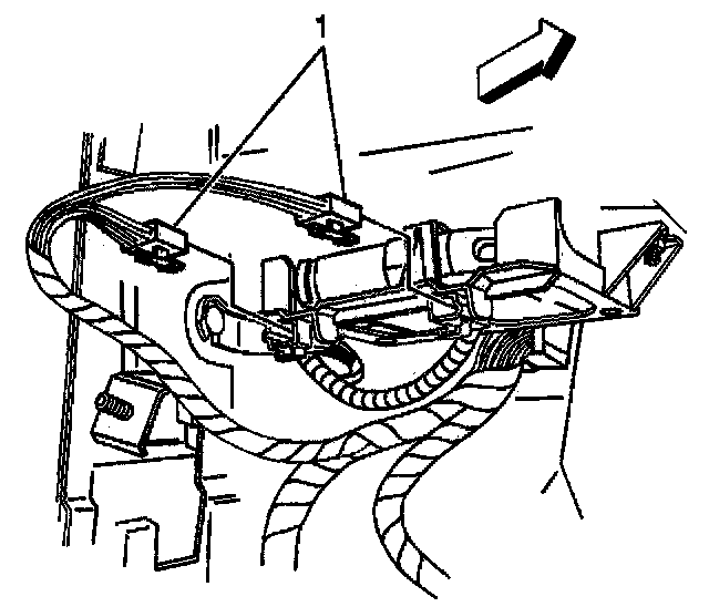 27. Tuck the harness into the opening forward of the battery tray (1).