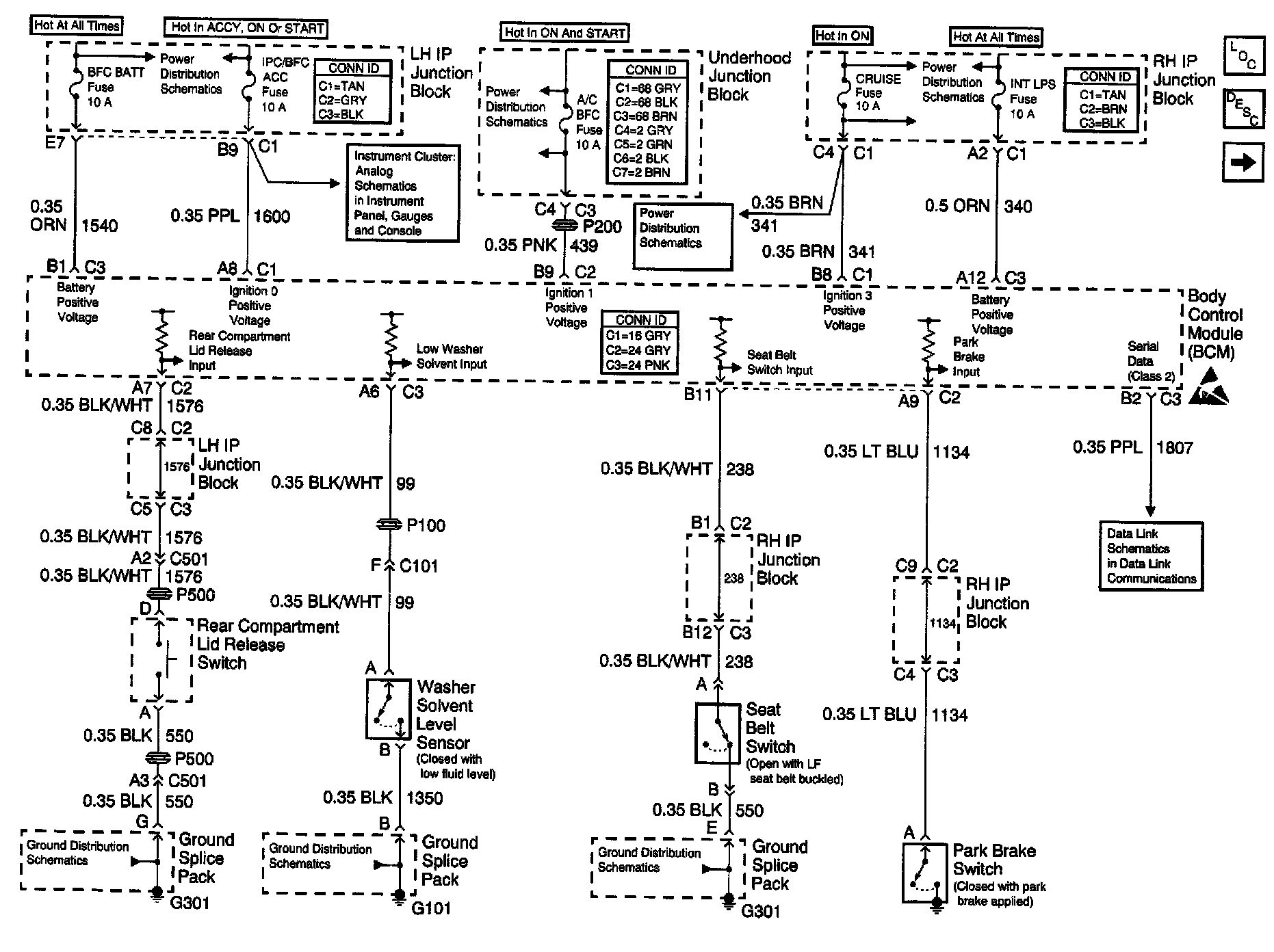 Body Control Module Schematics: Power Circuits, Washer Solvent Level Sensor, Seat Belt, Park Brake And Rear Compartment Switches: