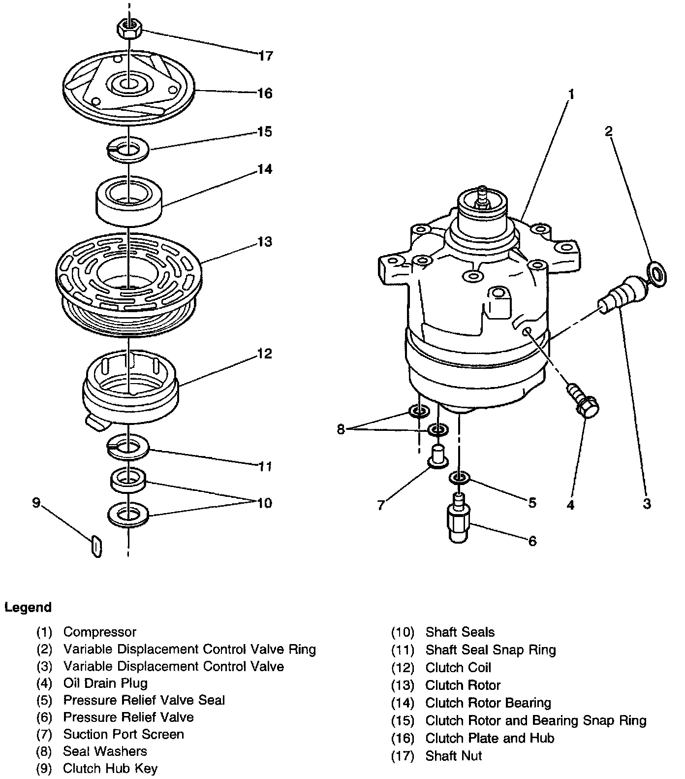 This A/C system uses the constant run V-5 compressor. The V-5 is a variable displacement compressor that can match the automotive A/C demand under all conditions without cycling. The basic compressor mechanism is a variable angle wobble-plate with 5 axially oriented cylinders. The center of control of the compressor displacement is a bellows actuated valve located in the rear head of the compressor that senses suction pressure. The difference in crankcase suction pressure controls the wobble-plate angle and the compressor displacement.