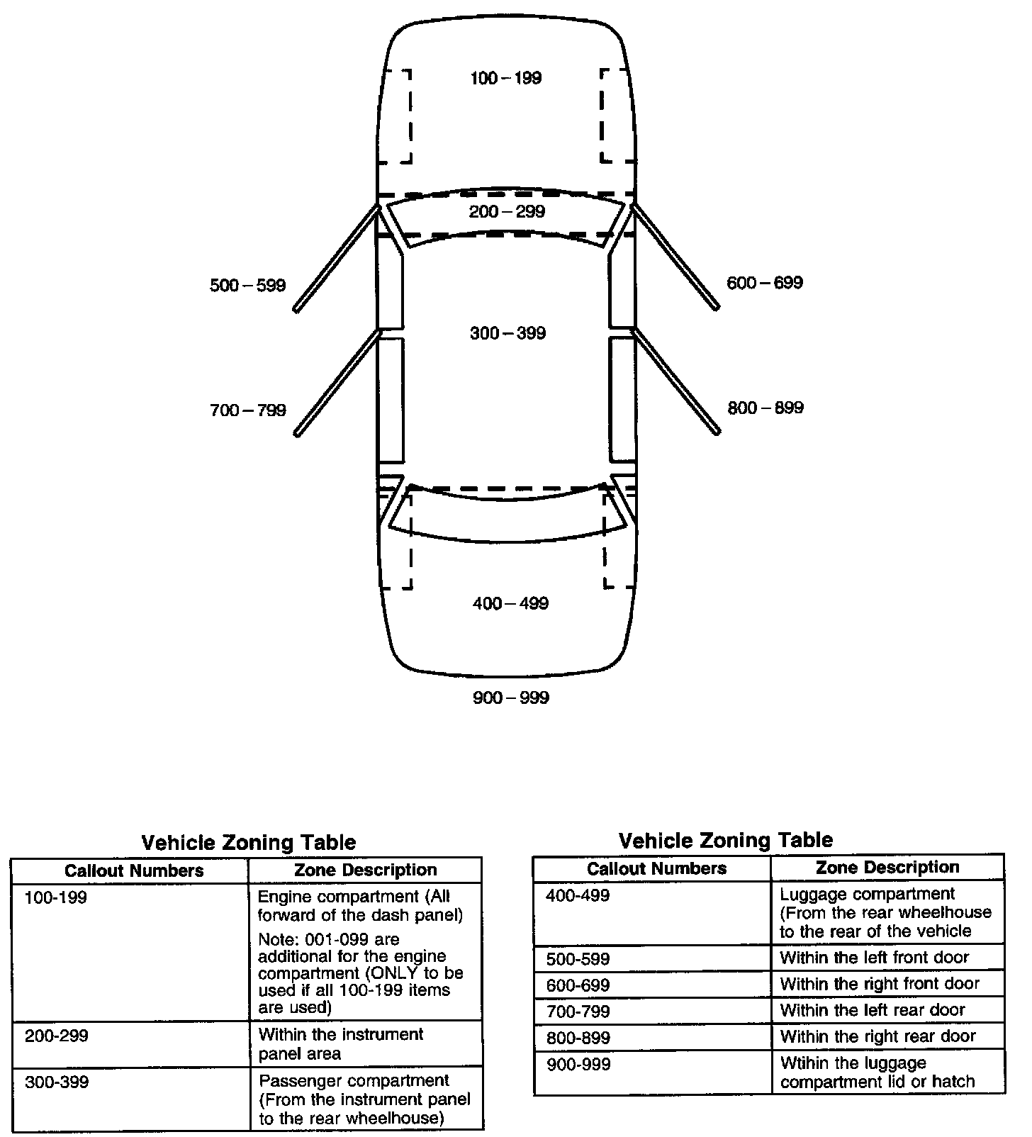 All grounds, in-line connectors, pass-through grommets, and splices have identifying numbers that correspond to where they are located in the vehicle The following table explains the numbering system.