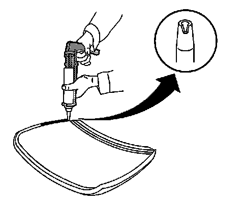 32. When using the extended method, use the edge of the rear window or the inside edge of the reveal molding as a guide for the nozzle in order to apply the urethane adhesive to the inner surface of the rear window.