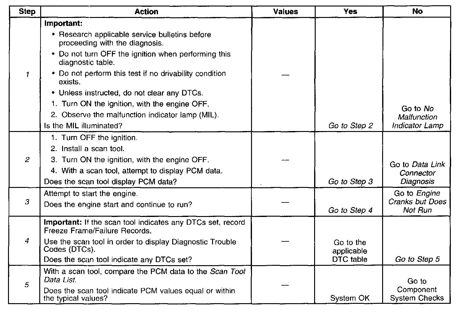 1. The MIL should be ON steady with the key ON, engine OFF. If not, the No Malfunction Indicator Lamp table should be used to isolate the malfunction.