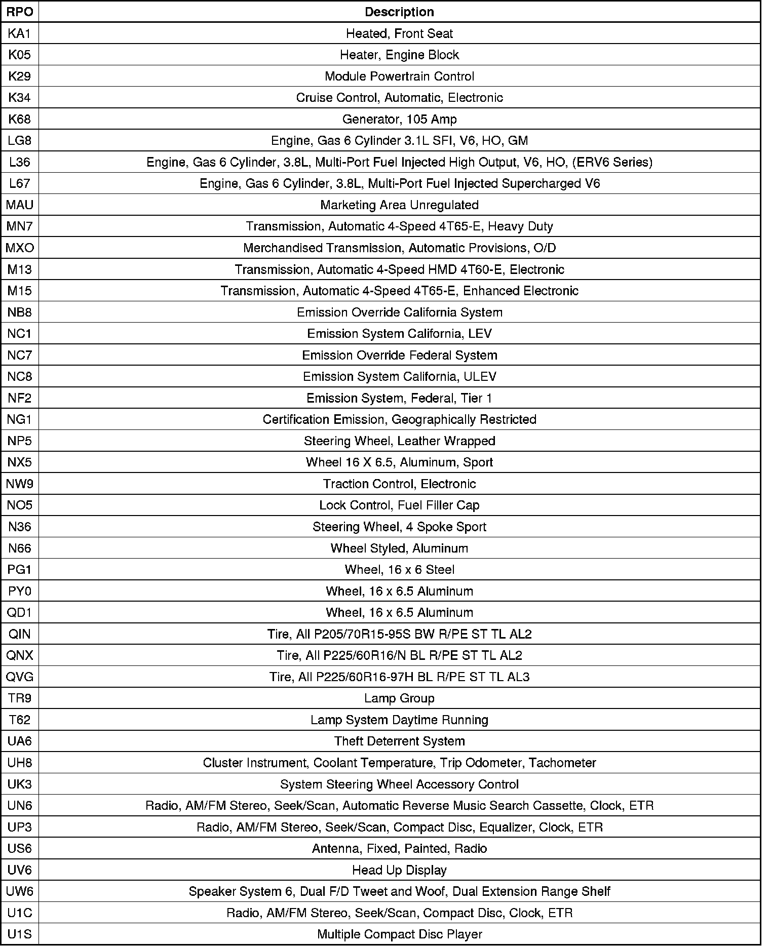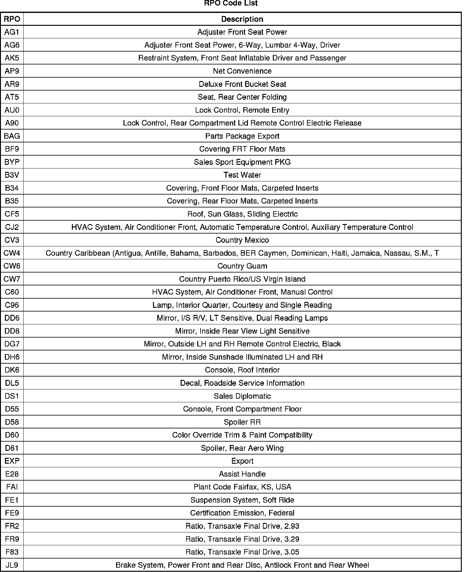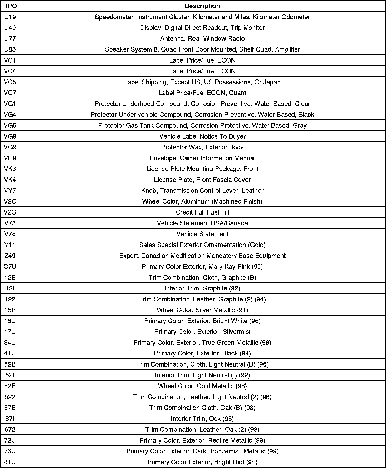 The following table provides the description of the Regular Production Option (RPO) codes used on the vehicle. The vehicle's RPO list is printed on the Service Parts Identification Label.