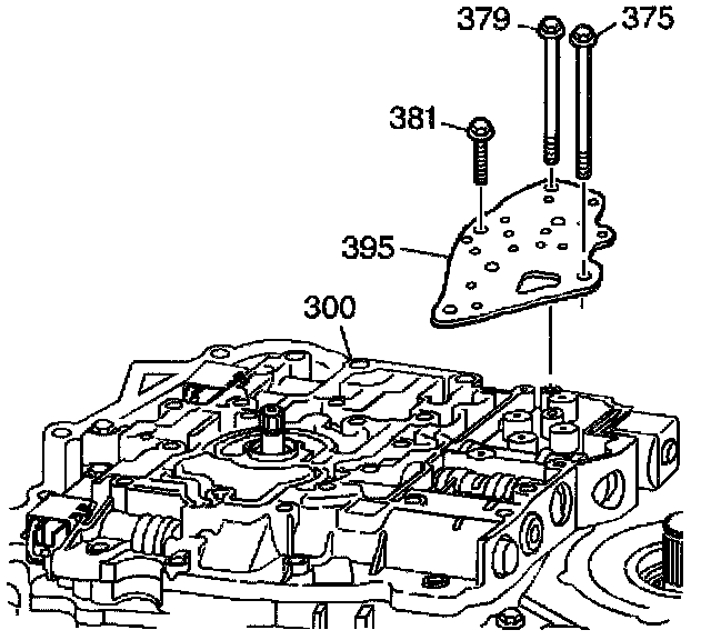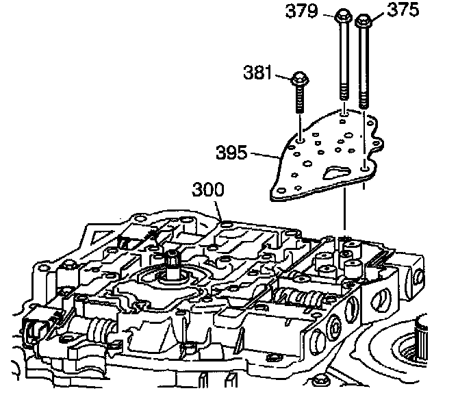 3. Remove the control valve body bolts (375, 379 and 381) that mount the fluid pressure manual valve position switch to the control valve body(300).