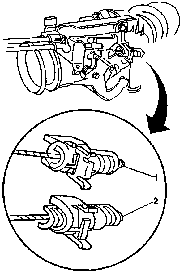 1. Clamp the side of the cruise control cable adjuster lock with a pair of pliers and pull the adjuster lock out in order to disengage the cruise control cable adjuster lock (1).