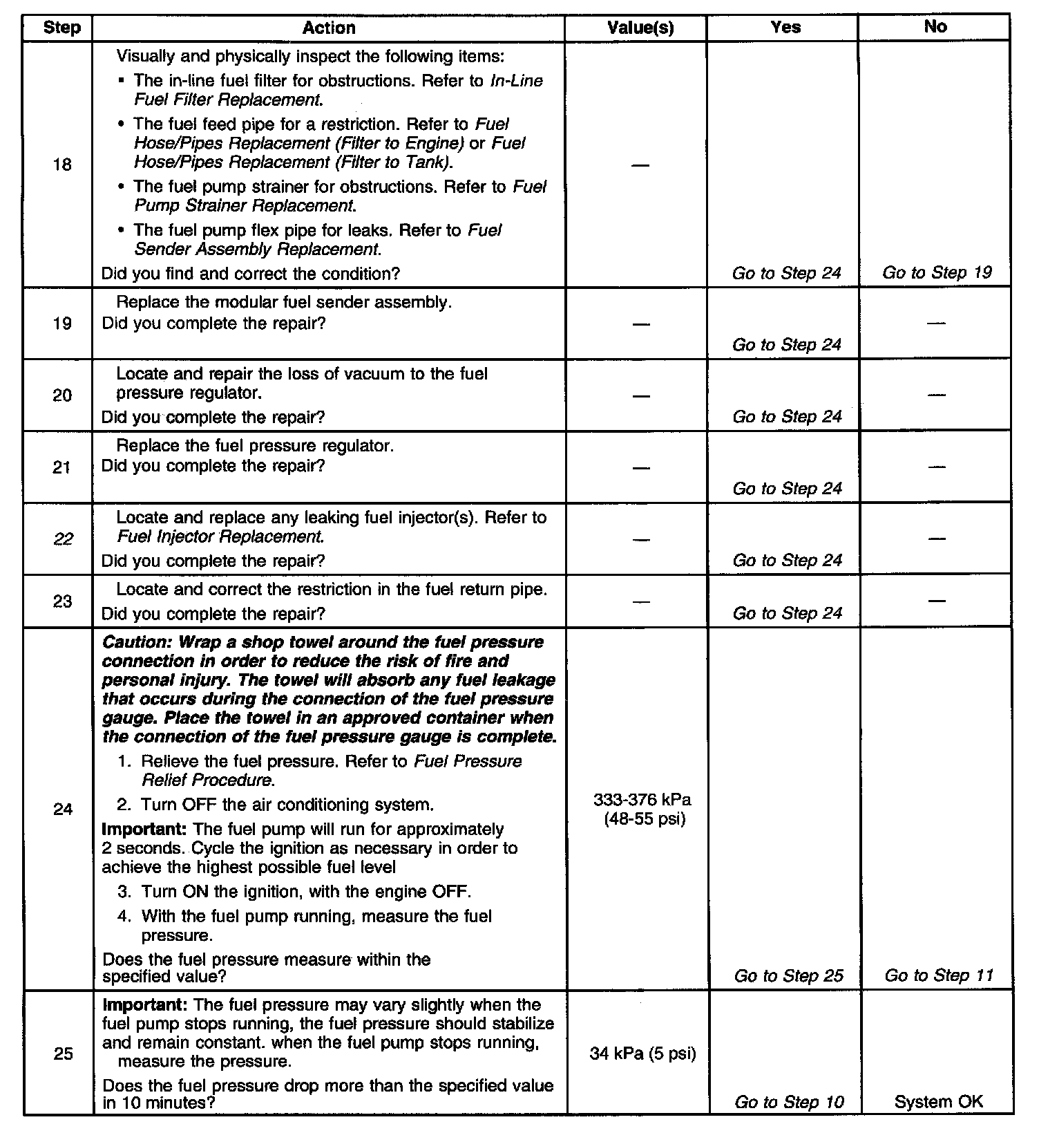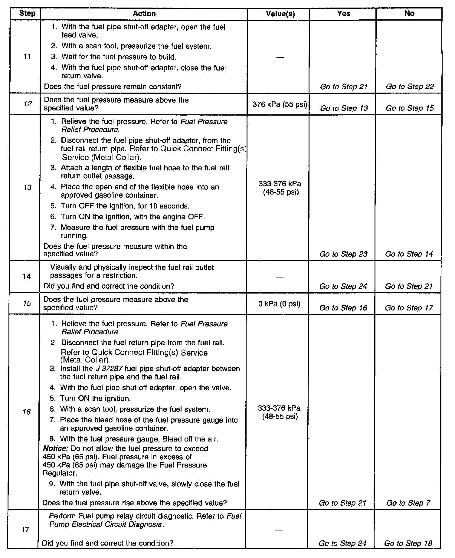 13. This test determines if the high fuel pressure is due to a restricted fuel return pipe or if the high fuel pressure is due to a faulty fuel pressure regulator.