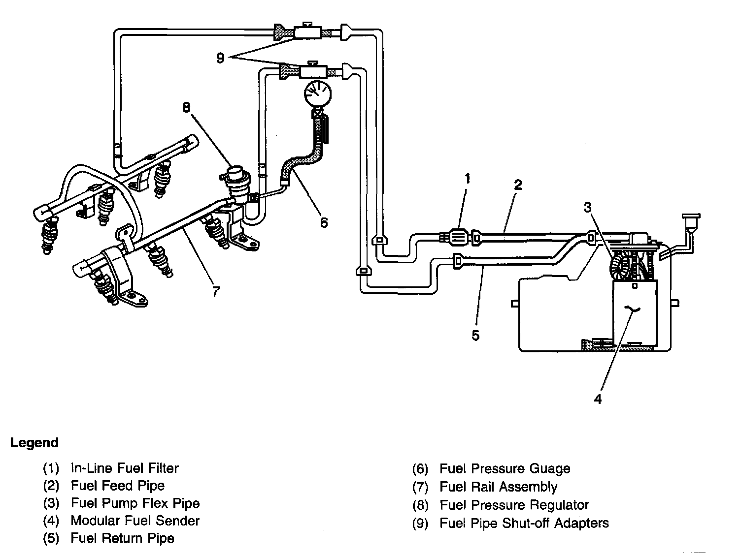 When the ignition switch is turned ON, the Powertrain Control Module (PCM) will turn ON the in-tank fuel pump. The in-tank fuel pump will remain ON as long as the engine is cranking or running and the PCM is receiving reference pulses. If there are no reference pulses, the PCM will turn the in-tank fuel pump OFF 2 seconds after the ignition switch is turned ON or 2 seconds after the engine stops running. The in-tank fuel pump is an electric pump within an integral reservoir. The in-tank fuel pump supplies fuel through the fuel feed pipe, and in-line fuel filter to the Fuel Rail Assembly. The fuel pump is designed to provide fuel at a pressure above the pressure needed by the fuel injectors. A fuel pressure regulator, attached to the Fuel Rail, keeps the fuel available to the fuel injectors at a regulated pressure. Unused fuel is returned to the fuel tank by a separate fuel return pipe. The fuel pressure gauge J 34730-1A and fuel pipe shut off adapters J 37287 are used for fuel system diagnosis.