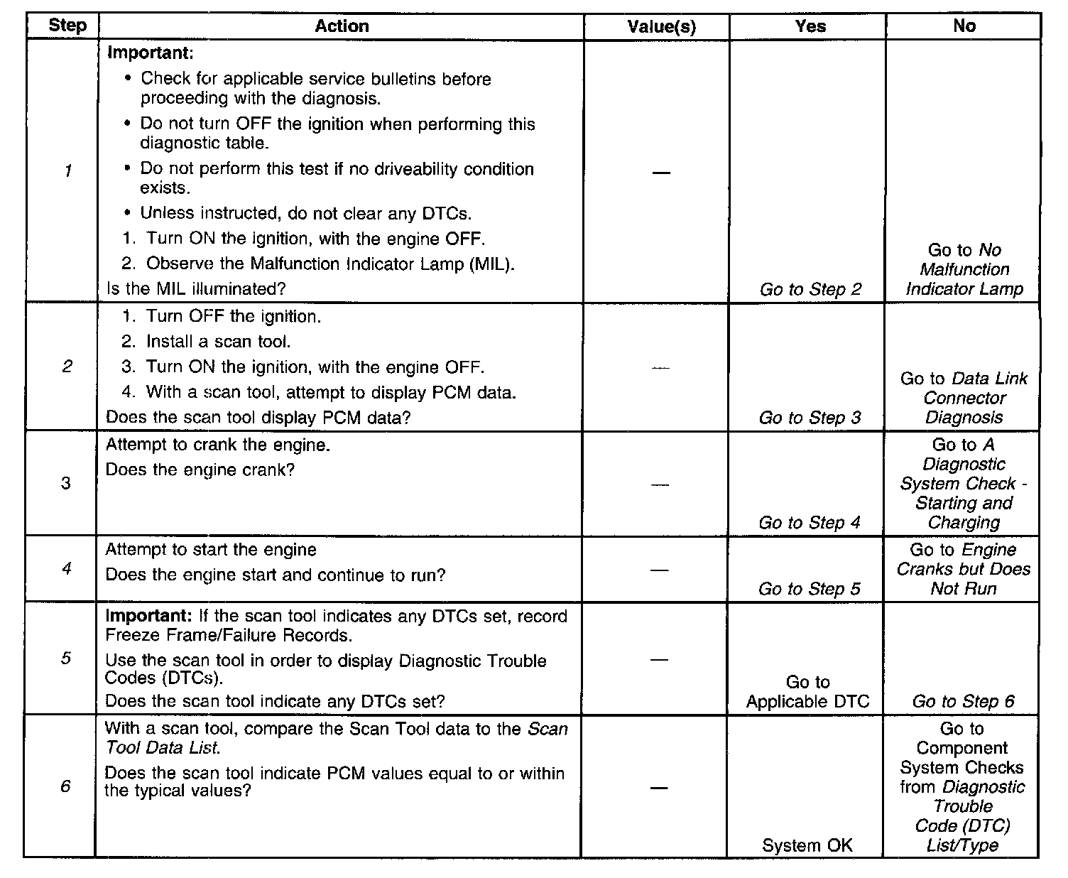 1. The MIL should be ON steady with the key ON/engine OFF. If not, the No Malfunction Indicator Lamp table should be used to isolate the malfunction.
