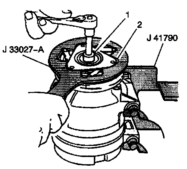 11. Hold the clutch plate and hub assembly (2) with the J 33027-A.