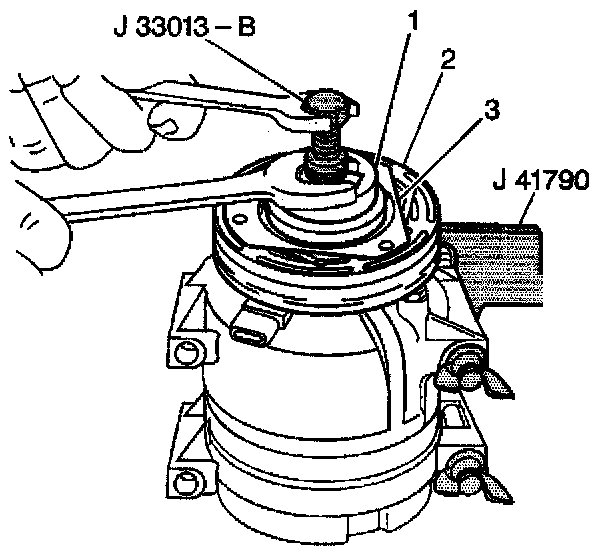 5. Install the J 33013-B and bearing tools (1) onto the clutch plate (3) and the hub assembly (2).