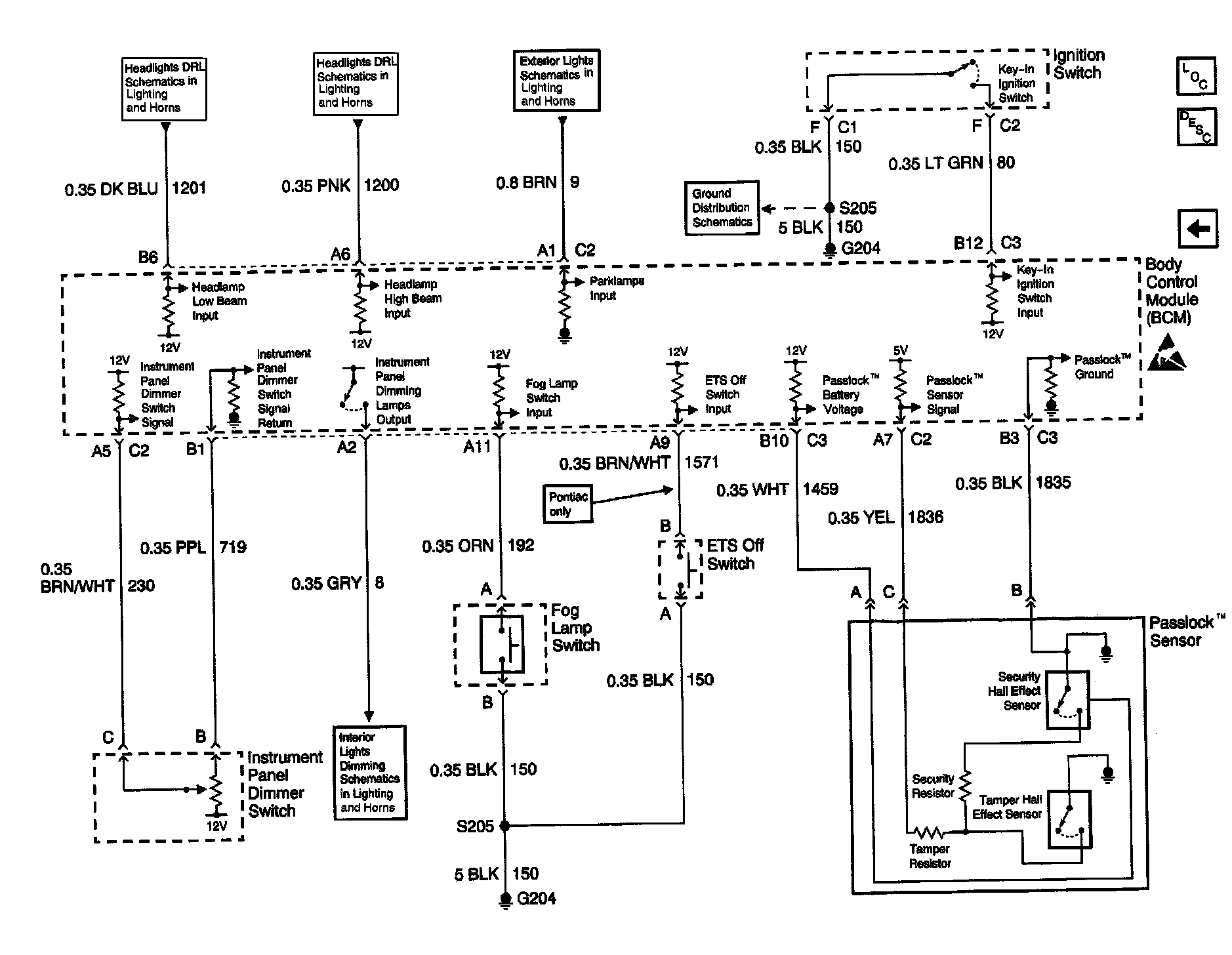 Body Control Module Schematics: Passlock Sensor(TM), Fog Lamp, Instrument Panel Dimmer, ETS Off and Ignition Switches: