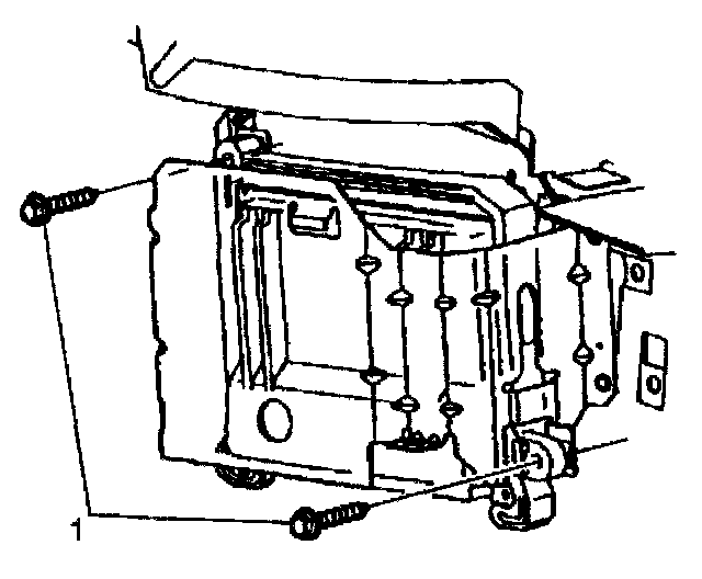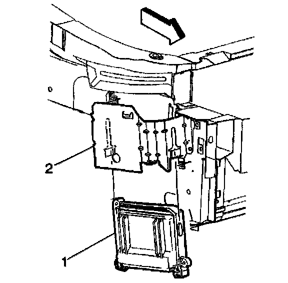 8. Slide the PCM and the retainer (1) from the PCM bracket (2).