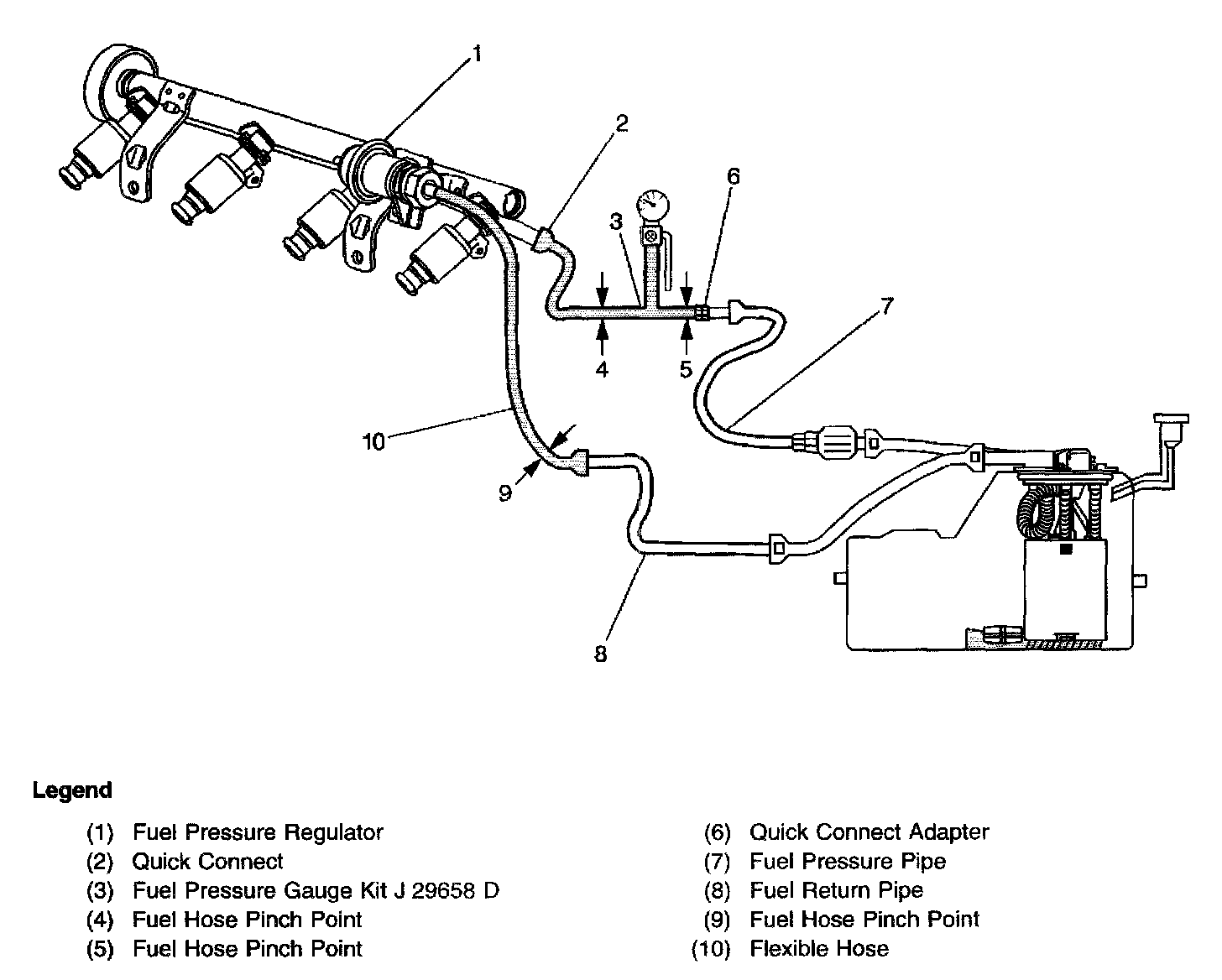 3. A fuel system that drops more than 5 psi in 10 minutes has a leak in one or more of the following areas: