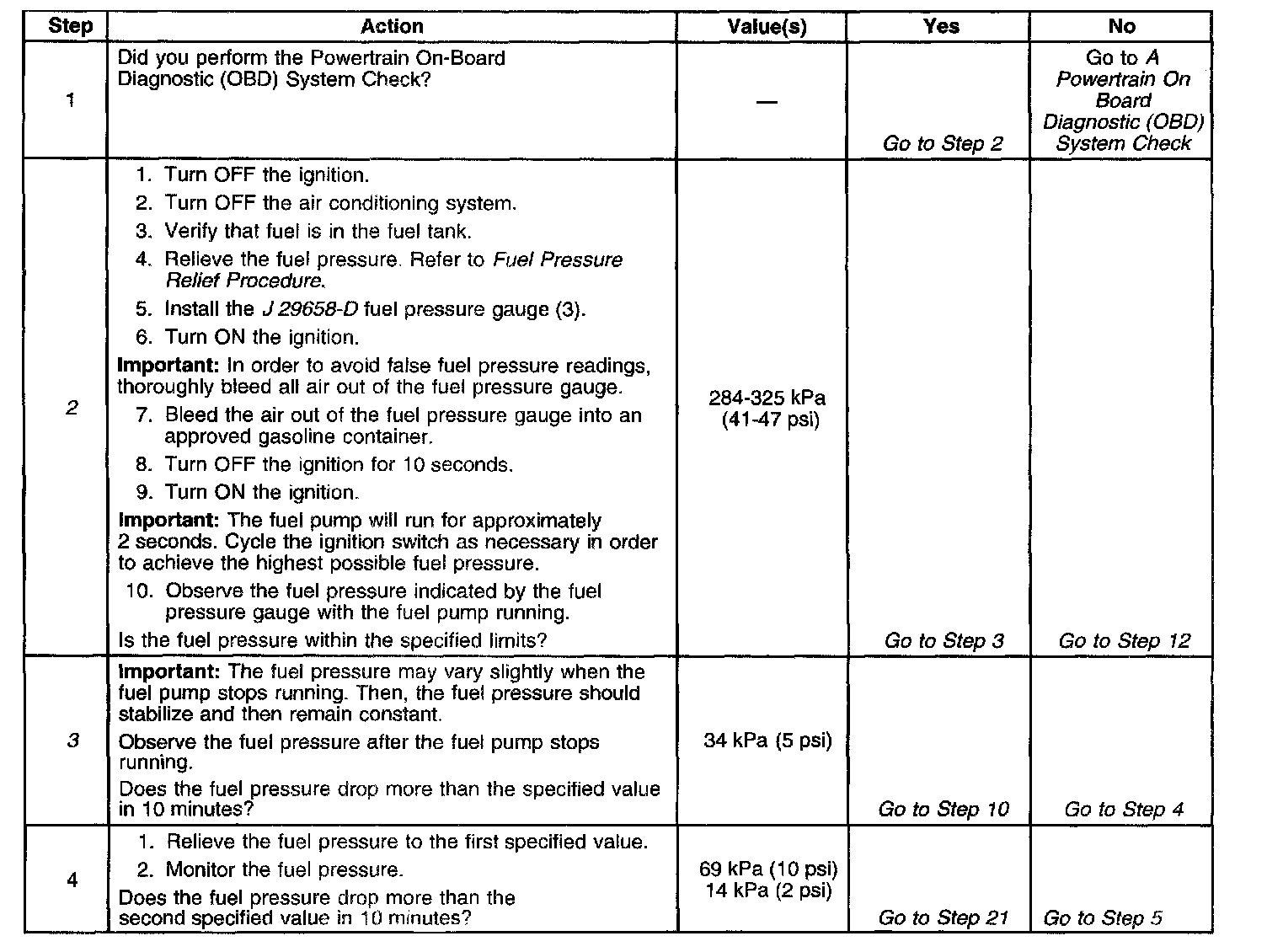 2. In order to relieve the fuel pressure, go to Fuel Pressure Relief Procedure. When the ignition is ON and the fuel pump is running, the fuel pressure indicated by the fuel pressure gauge should be 284-325 kPa (41-47 psi).