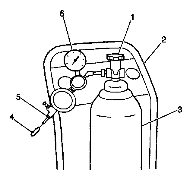 9. Disconnect the black hose (4) that connects the nitrogen cylinder to the [1][2]EVAP purge/pressure diagnostic station at the pressure regulator (5).