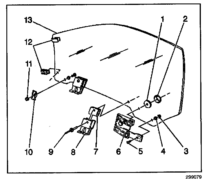 2. Install the nut washers that attach the door window glass (13) to the window regulator assembly.