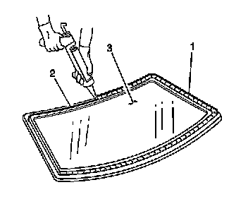 31. When using the extended method do the following, use the edge of the windshield window or the inside edge of the reveal molding as a guide for the nozzle in order to apply the urethane adhesive (1) to the inner surface of the windshield window. (3).