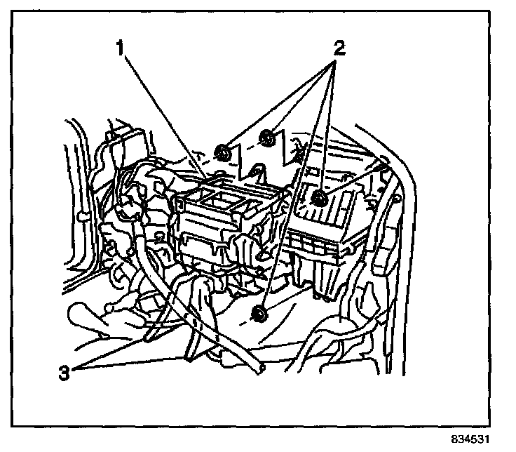 9. Separate the rear heater ducts (3) from the HVAC module assembly (1).