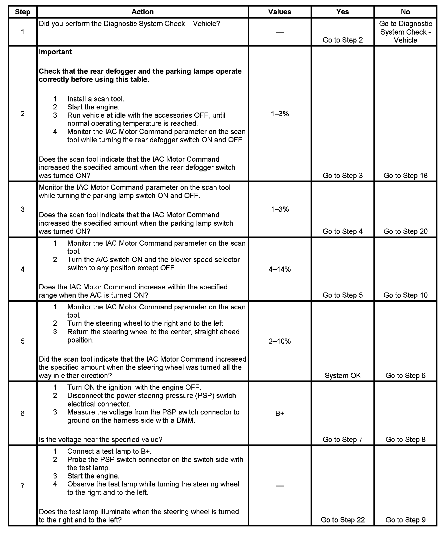 5. This step verifies the operation of the power steering pressure (PSP) switch circuit. If the engine idle speed and IAC Motor Command increase when the steering wheel is turned to 90 percent, the PSP switch idle circuit is functioning normally.