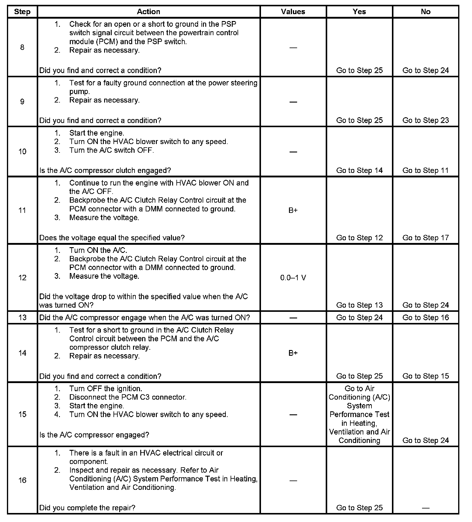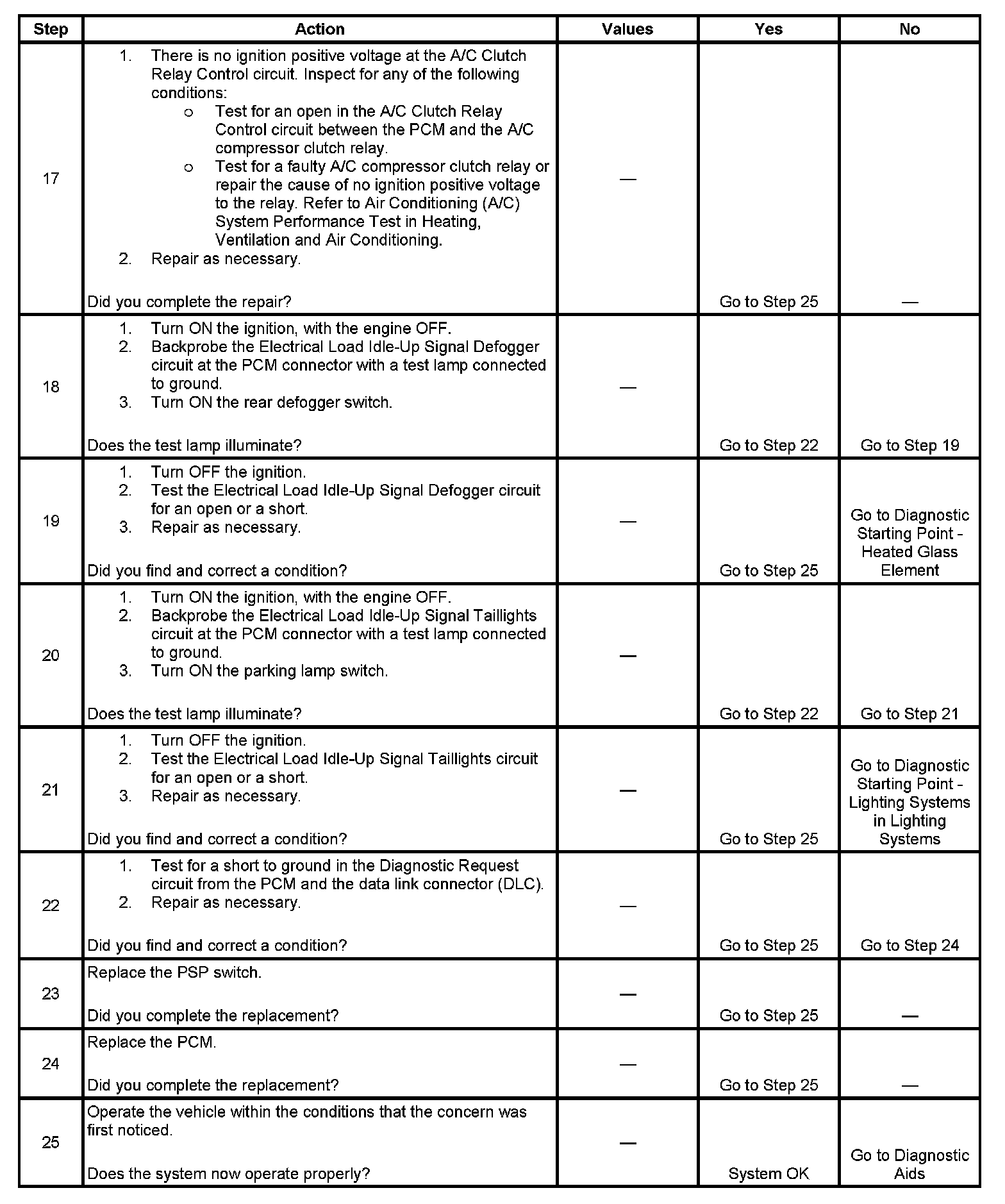 13. If the A/C compressor clutch engages, the compressor clutch, the relay, and the control circuit are all OK. The PCM will then need to be replaced because there was no increase in the IAC motor command percentage during A/C operation in Step 4.
