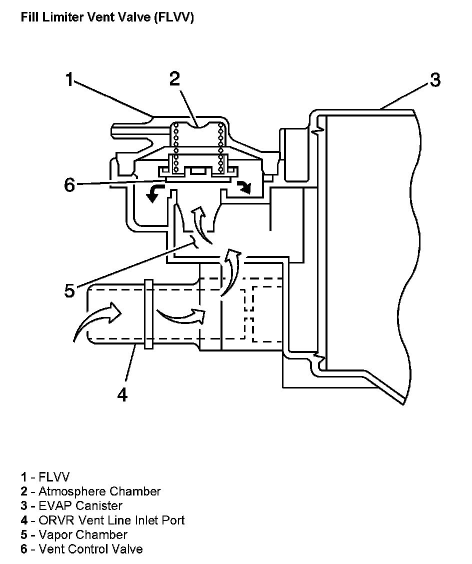 The fill limiter vent valve (FLVV) (1) is an integral part of the EVAP canister (3). The cross sectional view shows the path of fuel vapors passing thru the valve directly into the EVAP canister. When the fuel filler cap is removed during refueling, the atmosphere chamber (2) fills with atmospheric pressure that has entered thru the port from the fuel filler pipe. The pressure in the atmosphere chamber (2) opens the passage to the vapor chamber (5) by opening the vent control valve (6). Refueling causes the internal pressure in the fuel tank to increase, pushing fuel vapors into the ORVR port (4) and up thru the vent control valve (6) into the EVAP canister (3). When the fuel tank is full, the tank vapor control valve (5) closes, sealing off the passage into the EVAP canister.