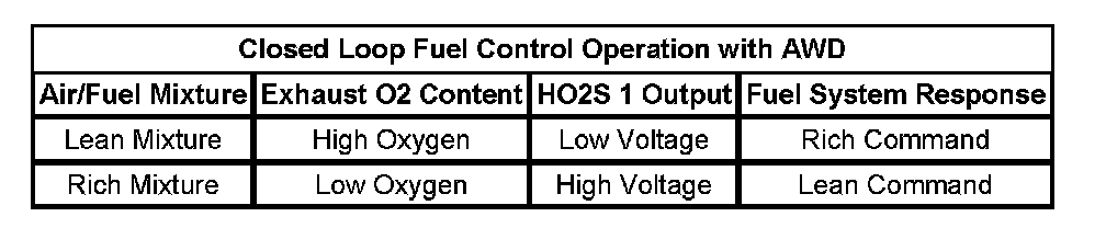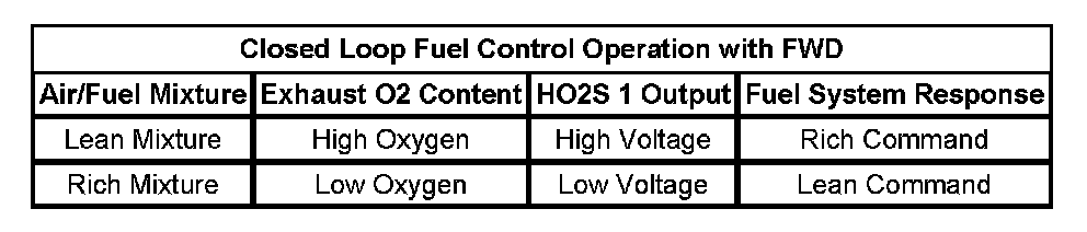 In order to obtain the most efficient engine performance with a good balance of power and fuel economy, the air/fuel mixture must be kept as close to the theoretical air/fuel ratio of 14.7:1 as possible. Maintaining the 14.7:1 air/fuel ratio also provides efficient operation of the 3-way catalytic converter (TWC) and a high clarification rate of CO, HC and NOx in the exhaust gas stream, In order to accomplish this the PCM first compares the input voltage from the heated oxygen sensor 1 (HO2S 1) with a specified reference voltage.