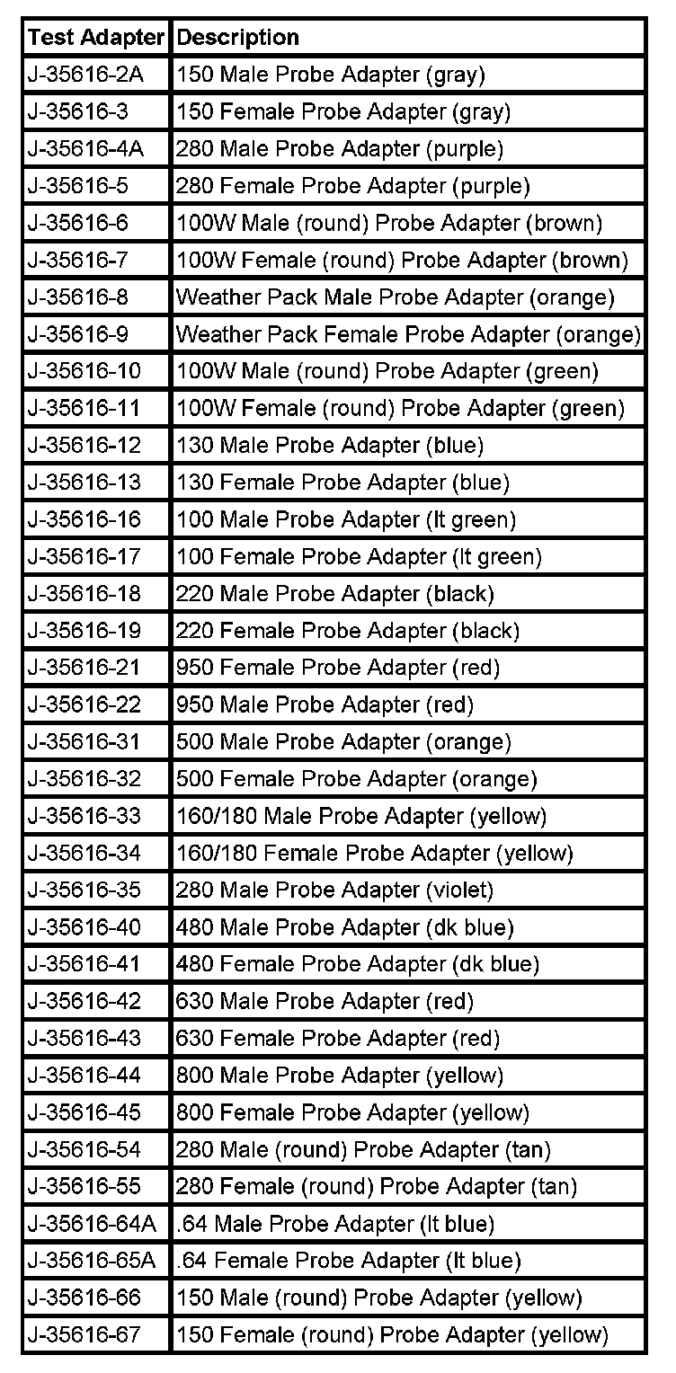 IMPORTANT: When probing female .64 terminals, it is important to use the correct adapter. There have been some revisions to the test adapter for 0.64 terminals. The proper adapter for .64 terminals is the J 35616-64A which has a tin terminal and a blue wire between the base and tip. Failure to use the proper test adapter may result in damage to the terminal being tested and improper diagnosis.