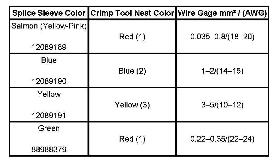 4. Select the proper DuraSeal splice sleeve according to the wire size. Refer to the above table at the beginning of the repair procedure for the color coding of the DuraSeal splice sleeves and the crimp tool nests.
