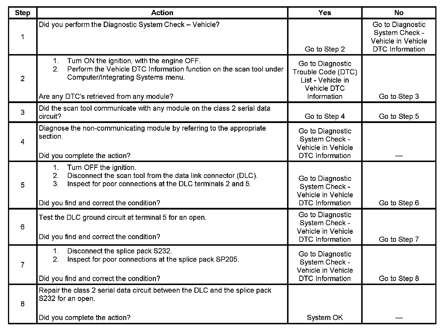 8. An open in the class 2 serial data circuit between the DLC and splice pack S232 will prevent the scan tool from communicating with any module on the class 2 network. This condition will not set a DTC.