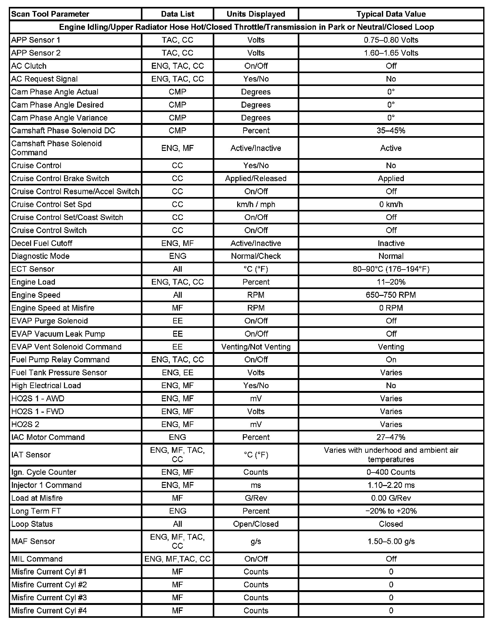 The Engine Scan Tool Data List contains all of the engine related parameters that are available on the scan tool. The list is arranged in alphabetical order.