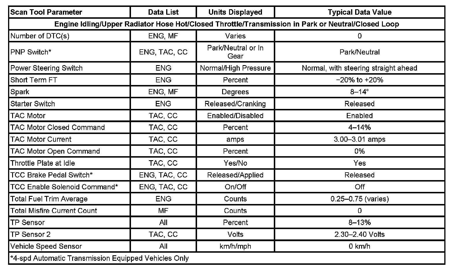 Scan tool values from a properly running engine may be used for comparison with the engine you are diagnosing. The Engine Scan Tool Data List represents values that would be seen on a normally running engine.