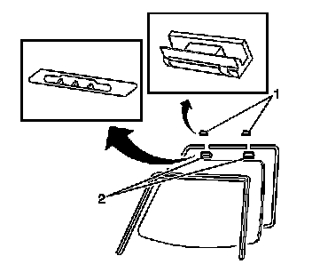 2. Remove the windshield inside garnish moldings (1) from the vehicle. Refer to Garnish Molding Replacement - Windshield Pillar (Removal and Replacement) .