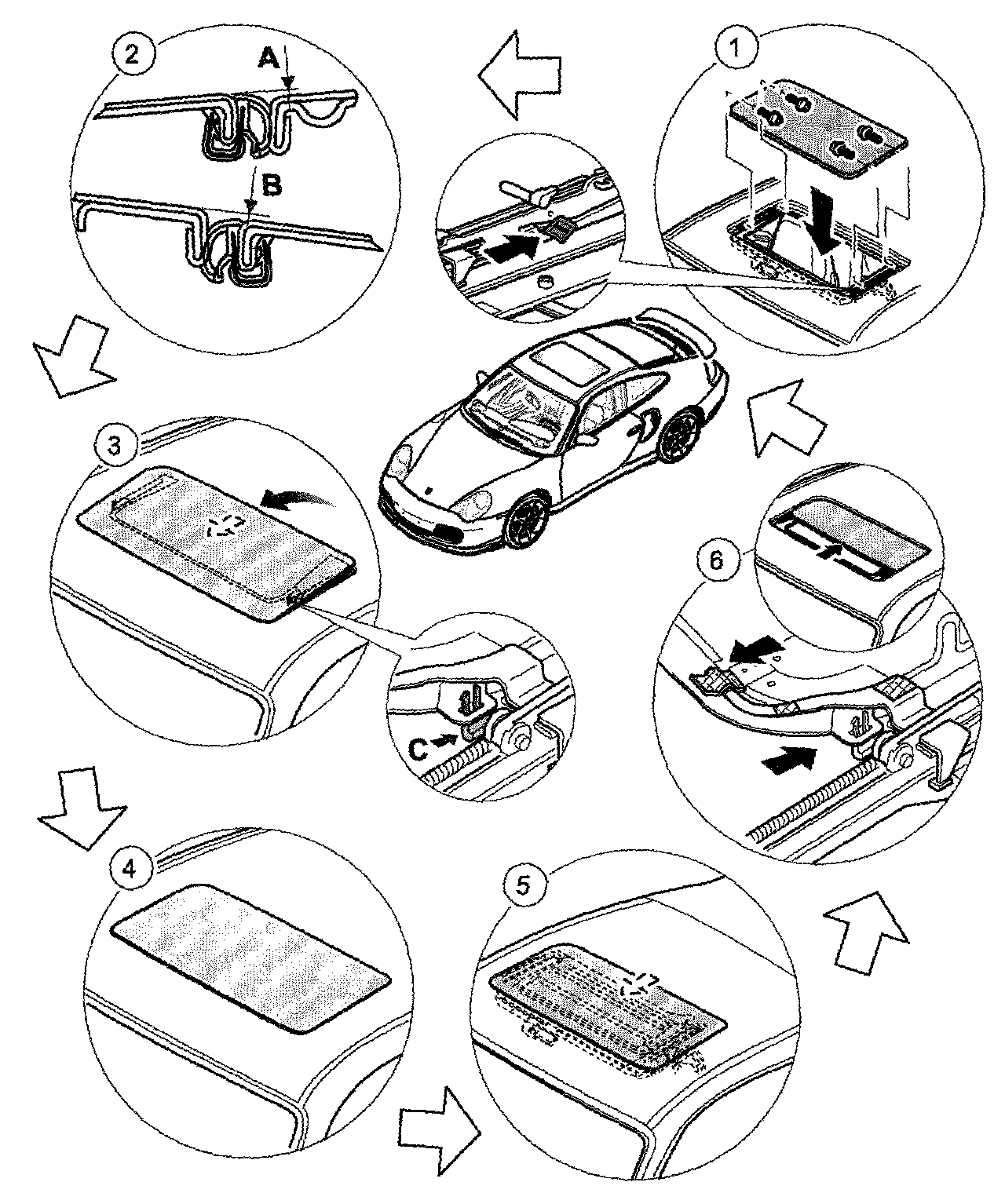 - Engage the left and right-hand inner side panels in the sliding/tilting roof trim. Repeat the procedure for installing the sliding roof panel.