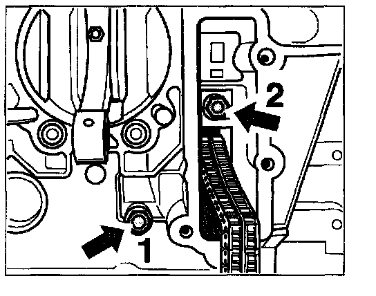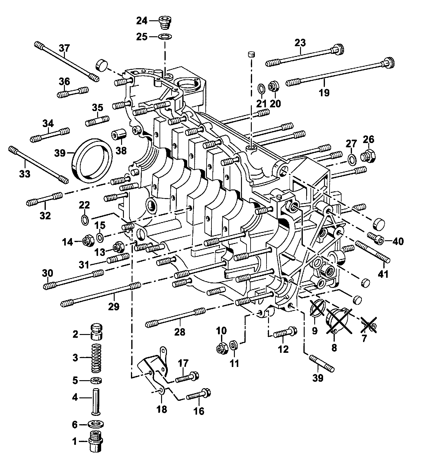 The tension rod bolts in thrust blocks 2, 3, 4 and 5 -arrows- can only be removed after removing the crankcase half (cylinder bank 1-3).